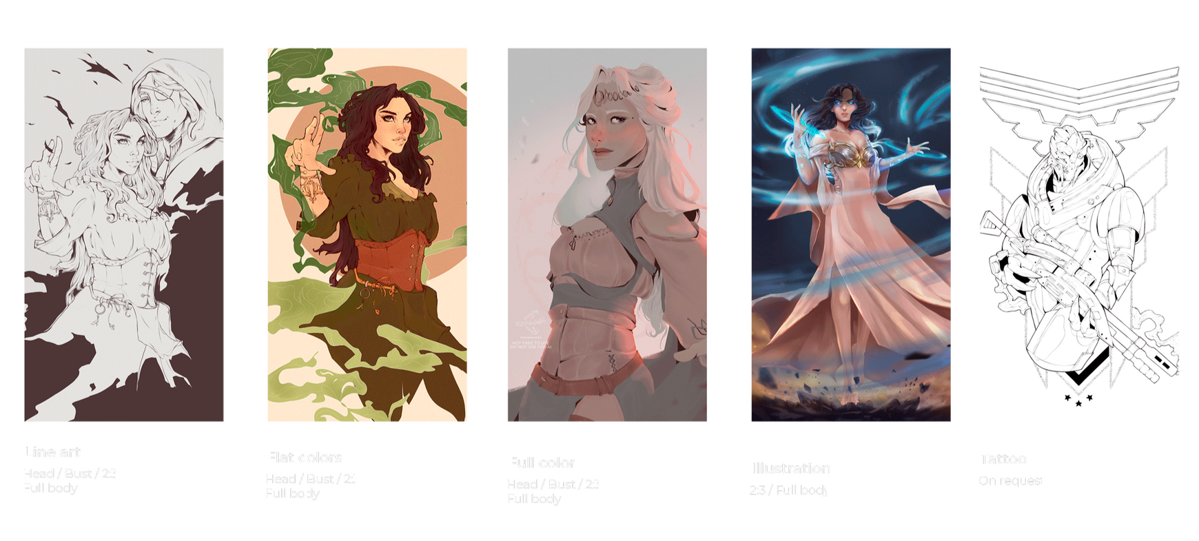 | Line art | Head / Bust / 2:3 / Full body | 35 / 40 / 45 / 50 | USD |